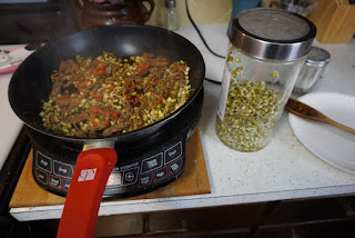 I remembered I had some mung bean sprouts and added them to my mixture of beef and peppers. Add your mung bean sprouts after you had cooked the beef. You do not need to overcook the spouts.